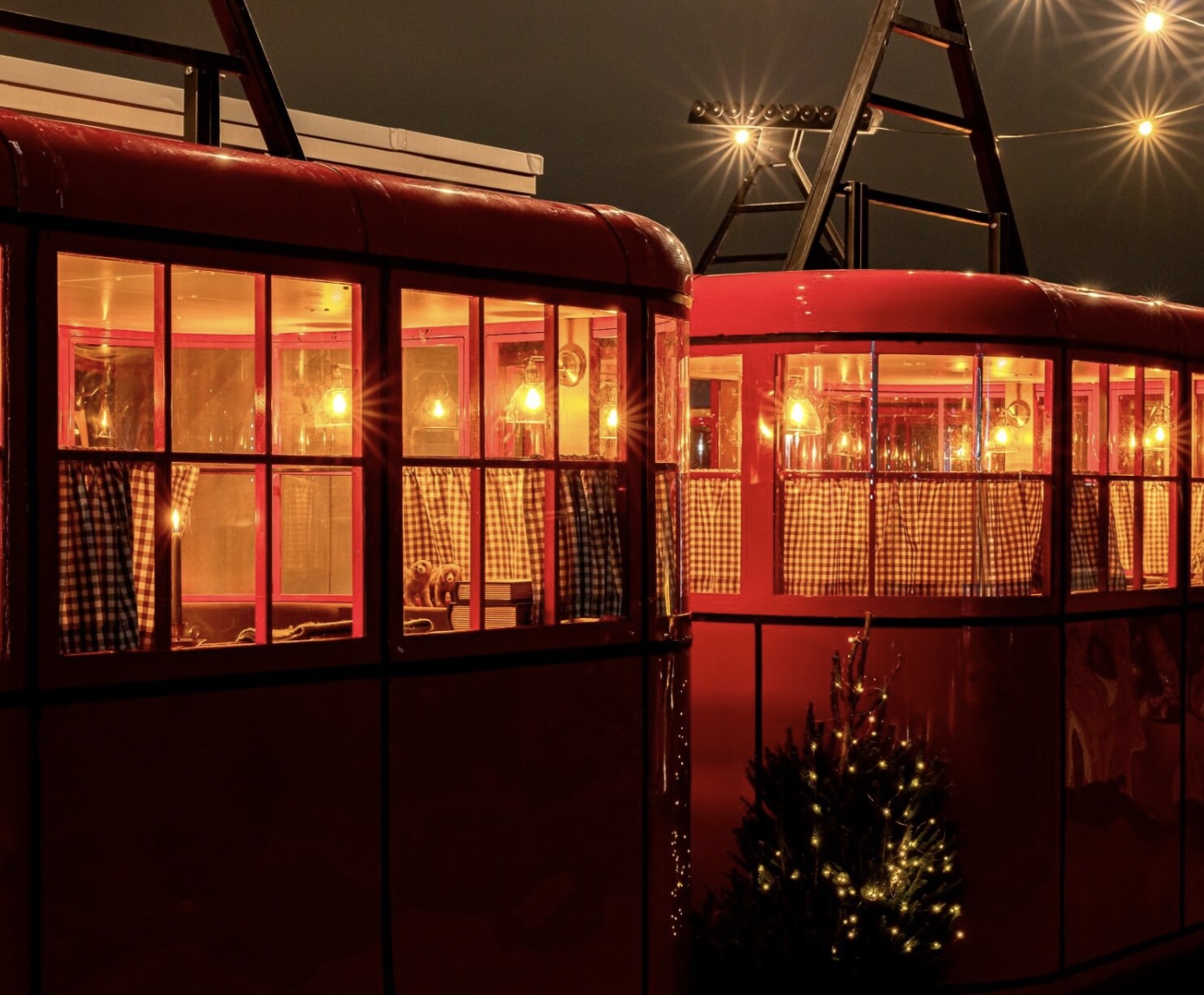 When you step into Feast Off-Piste, you’ll be greeted by ski gondolas. The experience is designed to recreate the magic of the mountains. Surrounded by snow-dusted trees, twinkling fairy lights and views over Winter Wonderland in Hyde Park, guests will step into an Alpine scene.