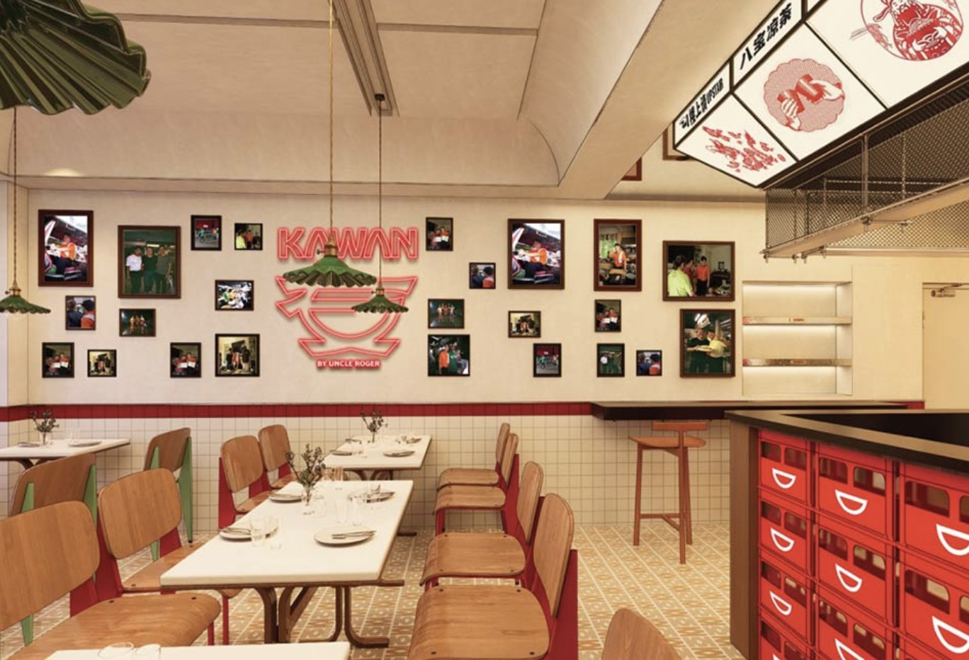The interiors at Kawan in London are casual and contemporary, featuring framed photographs of Nigel, low-hanging green lights and a bright red logo. Tiled floors, cream-and-white walls, and wooden seating create a relaxed setting. Guests can choose between counter seating and tables.